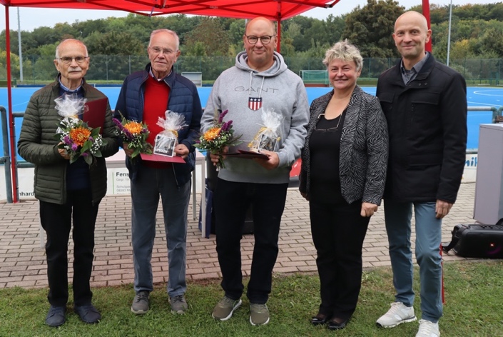 Die Ehrennadel des SV Motor Meerane für Engagement für den Hockeysport in Meerane überreichte Bürgermeister Jörg Schmeißer (re.) mit Ute Feistel, Vorstandsmitglied, an Manfred Hertzsch (hier sein Sohn Thomas), Reinhard Mißler und Peter Ohl