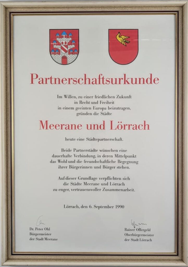 Am 6. September 1990 besiegelten der Lörracher Oberbürgermeister Rainer Offergeld und der Meeraner Bürgermeister Peter Ohl im Lörracher Rathaus in Anwesenheit der Räte beider Städte und von Gästen der Bürgerschaft die Partnerschaftsurkunde. Diese Partnerschaft begleitete uns in die kommunale Selbstverwaltung. Bis in die heutige Generation bestehen gute persönliche Kontakte und Freundschaften.