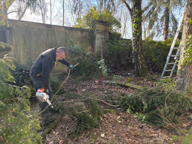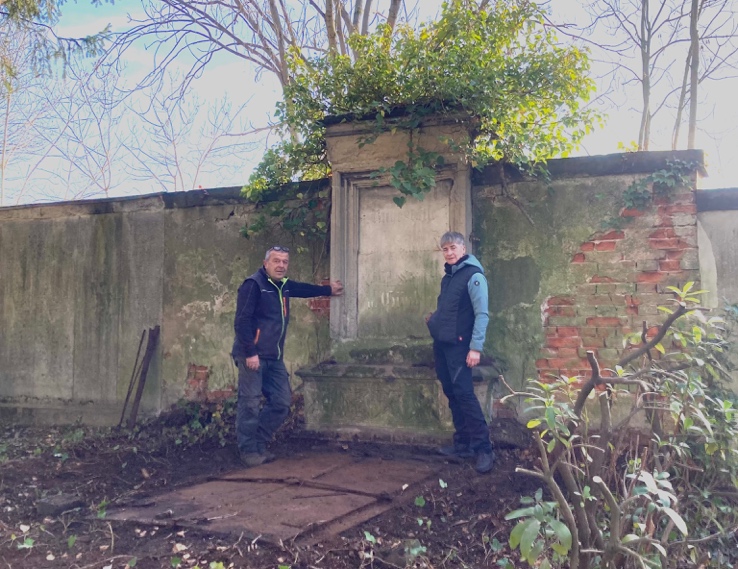 Nachdem die Arbeiten am Moeschler-Grab Ende 2025 abgeschlossen werden konnten, wurde in der Mitgliederversammlung des Förderkreises Friedhof Meerane e.V. im Dezember ein neues Sanierungsprojekt vorgestellt. Wenn man die alte Friedhofsmauer am Franzenweg an der Moeschler- und Schmieder-Grabstätte vorbei weiter geht, konnte man eine weitere interessante Grabstätte zugewuchert durch Rhododendren und Efeu erahnen. Unser Interesse war geweckt.