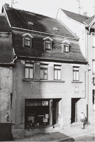 Das Mäder Haus mit dem großen Schaufenster steht in der Reihe links neben der Löwenapotheke. Rechts noch einmal einzeln. Später befand sich da eine Altstoffannahme. Ein entsprechendes Foto haben wir finden können. Vielleicht gibt es weitere Informationen über die Uhrmacher Mäder, die uns hier weiterhelfen können. Für jeden noch so kleinen Hinweis sind wir dankbar.